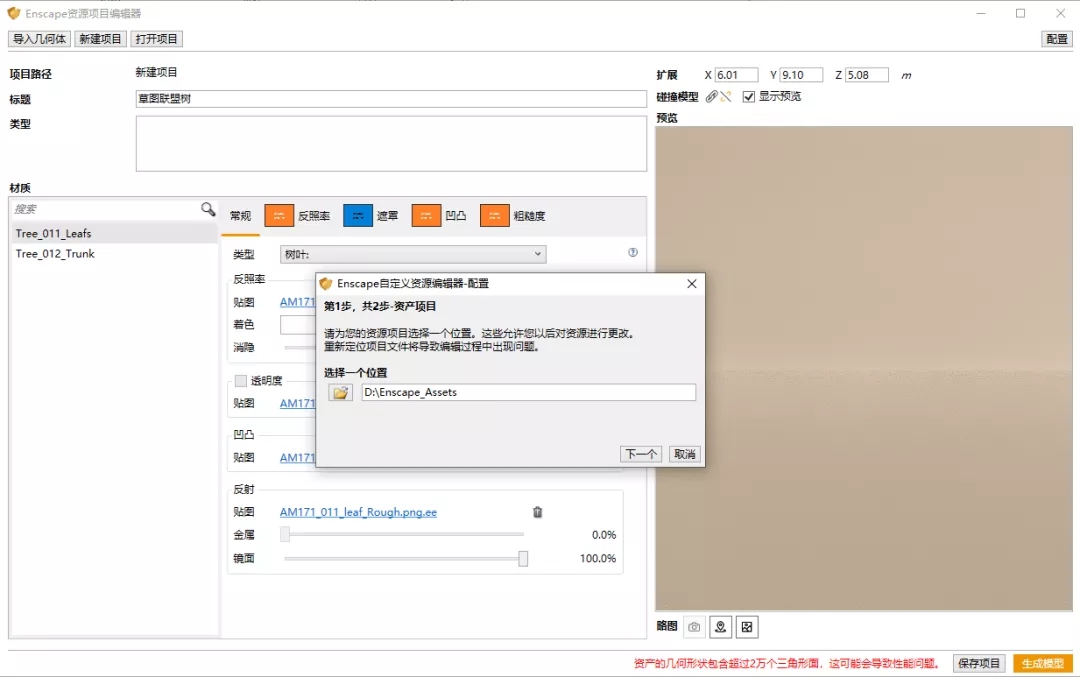 点击文件夹图标,首次弹出对话框选择离线库和自定义资源项目的保存路径。注意首次使用离线库会分两步,第一步是指定离线库的位置,例如草图联盟网发布的离线资源库只需指定Enscape_Assets文件夹即可。
