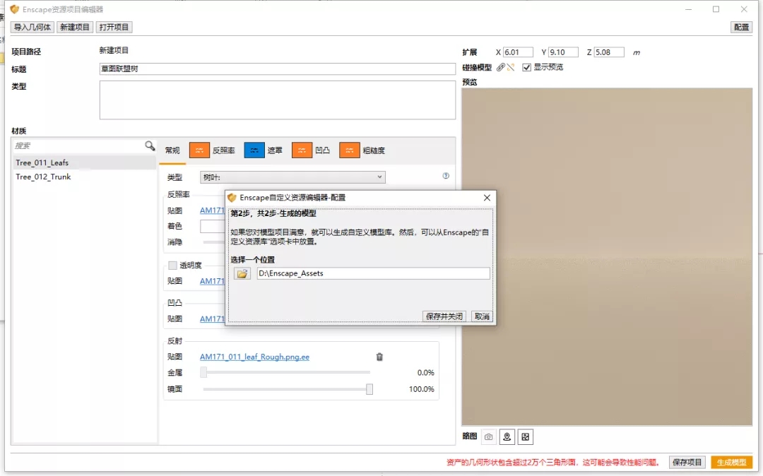 第二步是指定自定义资源项目的保存路径,当然你也可指向同一个文件夹。指定好离线资源路径后当我们使用离线资源库时就不会再连接Enscape官方在线资源库了,这样代理模型都是秒加载。