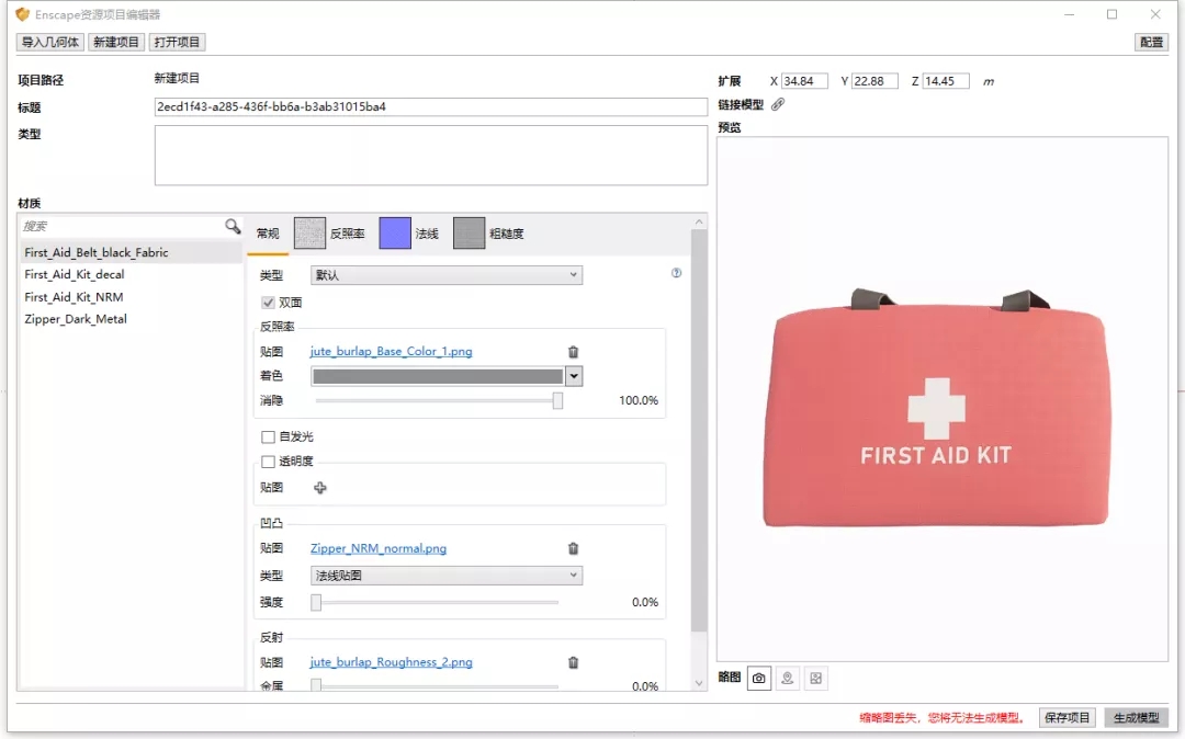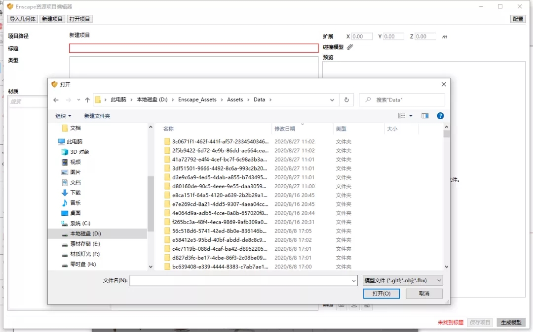 弹出来的页面点击顶部导入几何体即可制作自己的资源模型库,自定义资源编辑器目前仅支持三种格式的模型导入,glTF、OBJ、FBX。支持格式有点少,但是这不是重点。重点是Enscape官方的离线资源库都是gLTF格式的。这样我们可以导入Enscape离线资源库中的模型并且能对材质进行编辑。编辑完别忘了保存并生成模型!