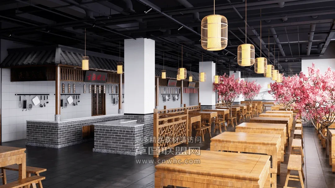 Enscape新中式餐厅场景SketchUp草图大师模型下载1256