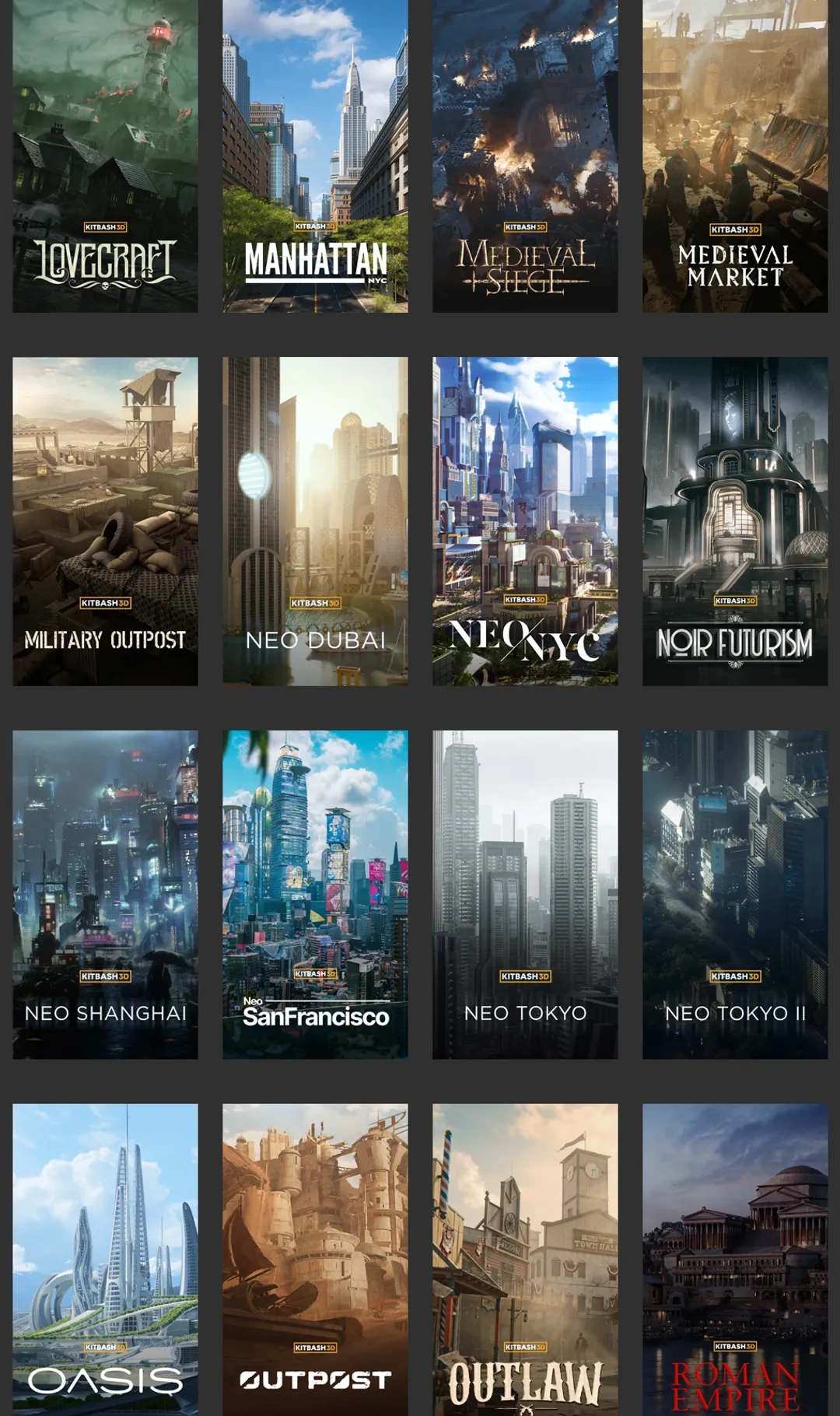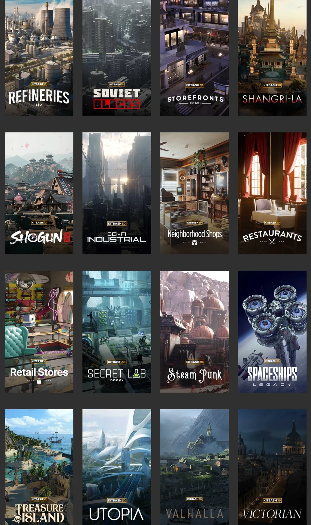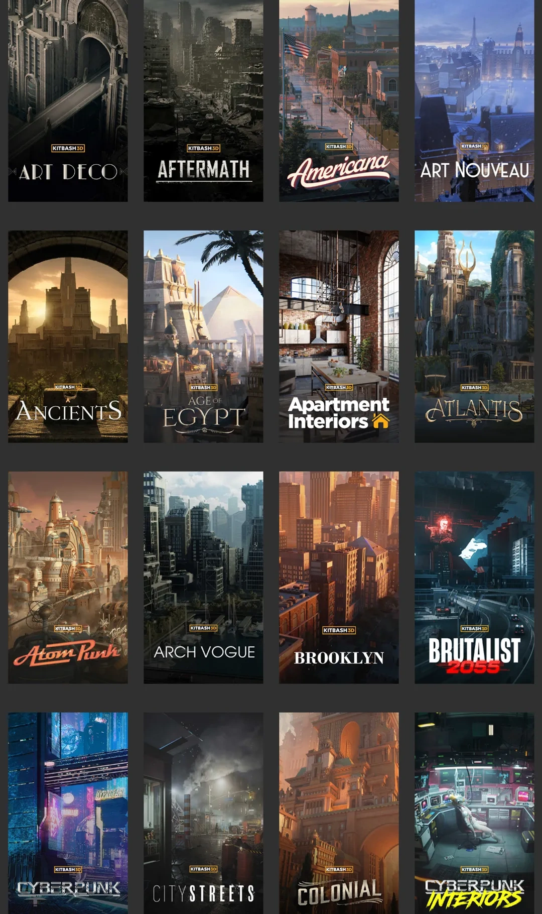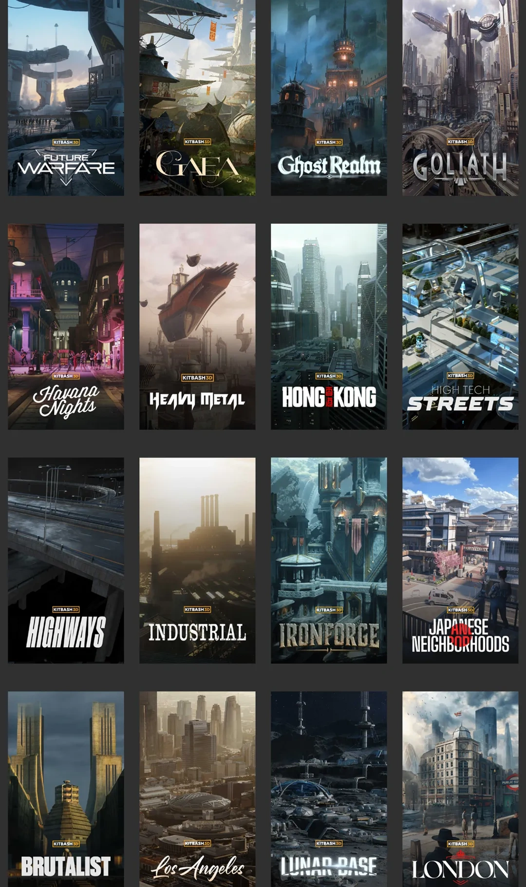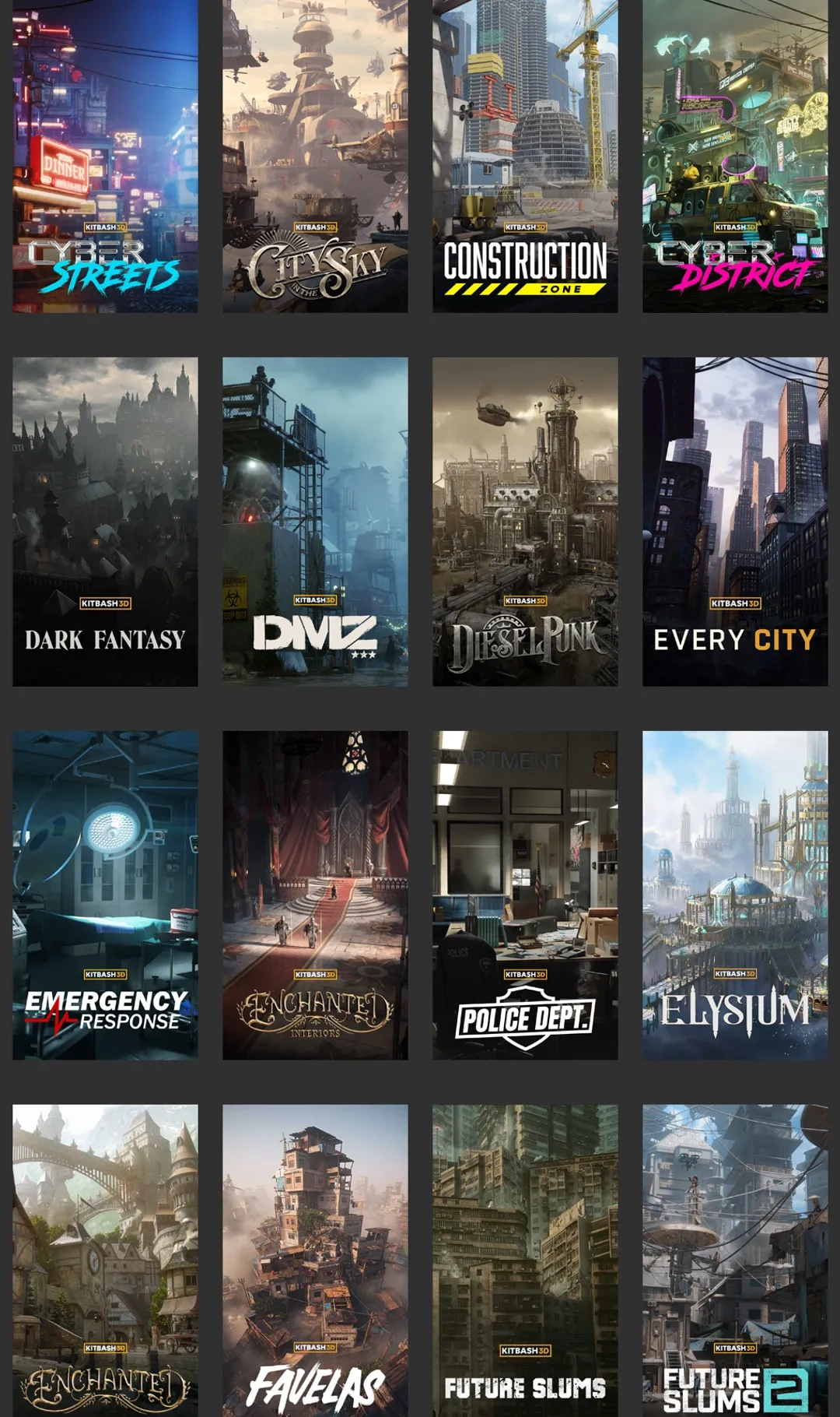 Kitbash3D是知名模型资产商,本集包含105套Kitbash3D资产。除blender资产外部分合集包含Unity、Unreal、3DS Max、C4D、FBX、OBJ、Houdini、Maya模型。