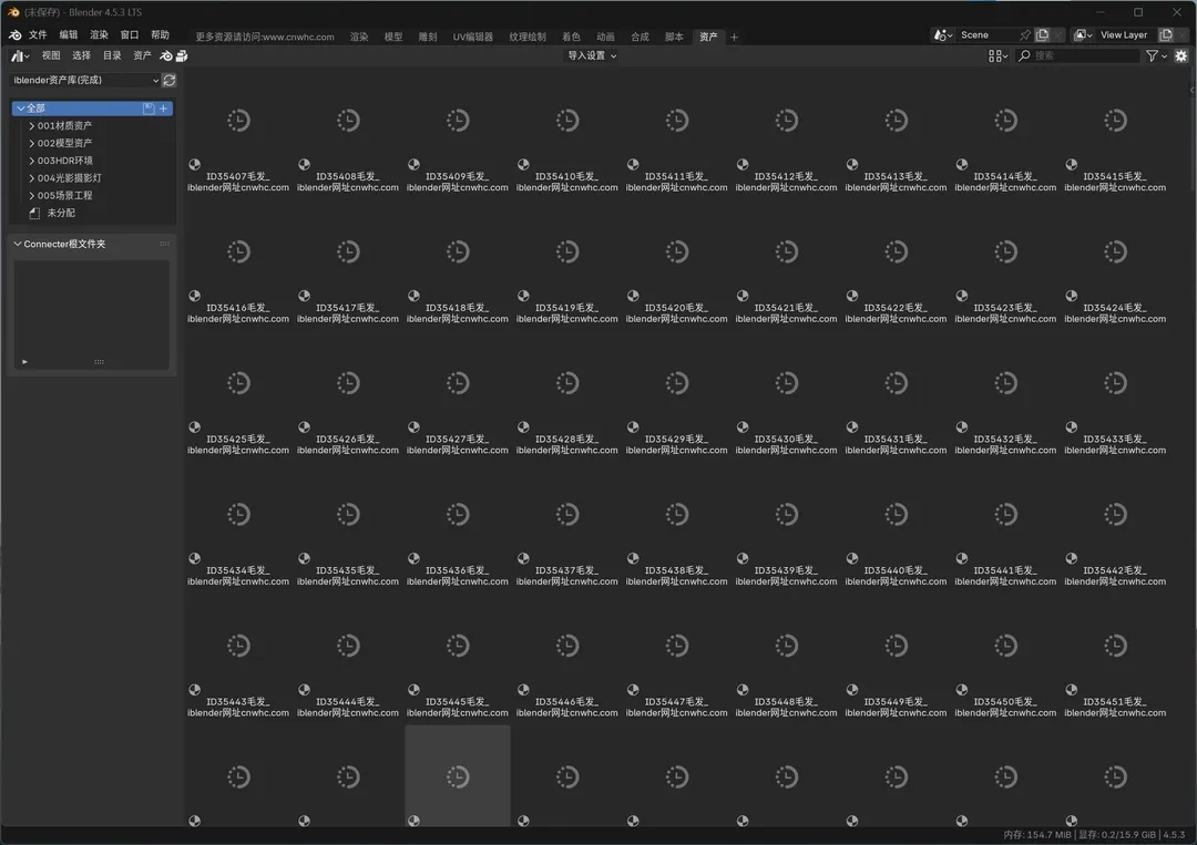 3.等待资产刷新完成就如上图显示资产预览图了,首次使用资产刷新速度取决于资产塑料和硬盘的传输速度。