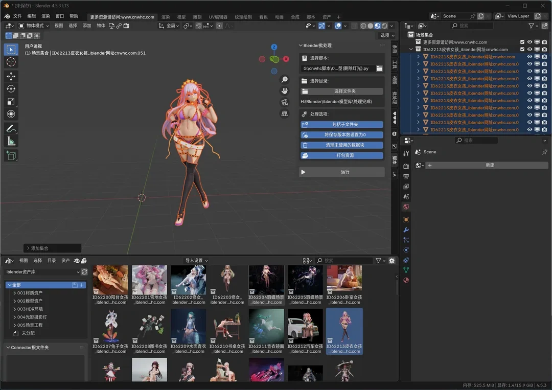 4.等待资产刷新完成就可以使用了,材质资产拖动到模型上,模型资产、HDR环境、灯光资产直接拖动到场景中即可。场景工程属于独立文件直接双击打开Blender文件即可。